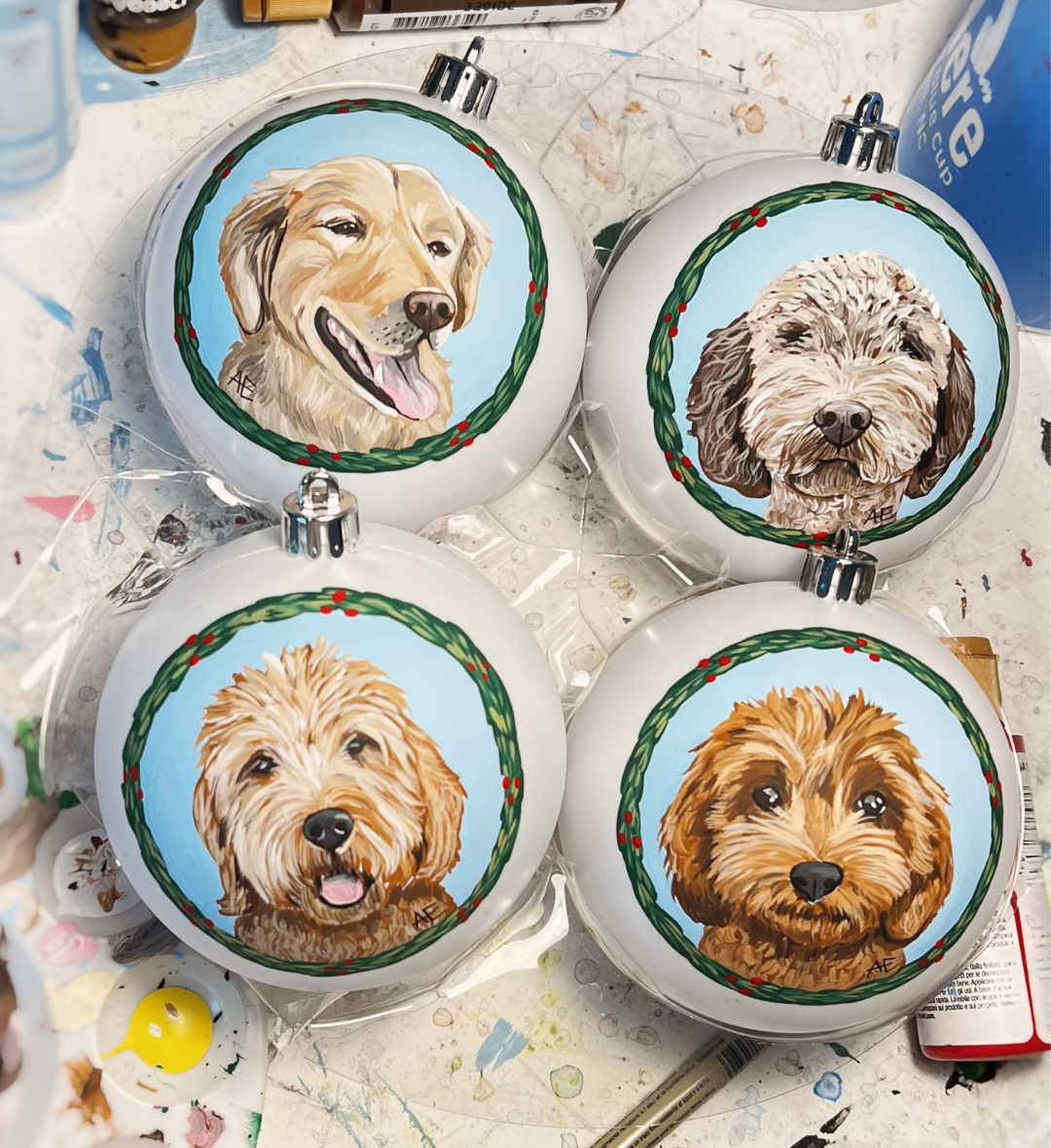 Custom hand-painted pet portrait ornaments are available year-round. The perfect gift for your pet-obsessed friends!